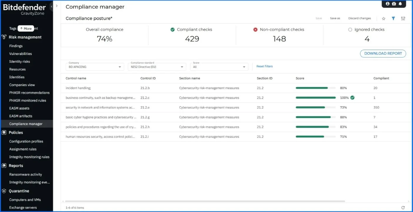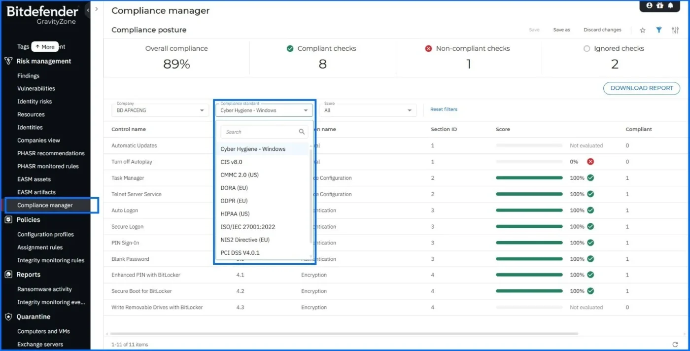 Замість того, щоб збирати чеклісти вручну, можна скористатися Bitdefender Compliance Manager — рішенням, де ці стандарти вже інтегровані в систему.