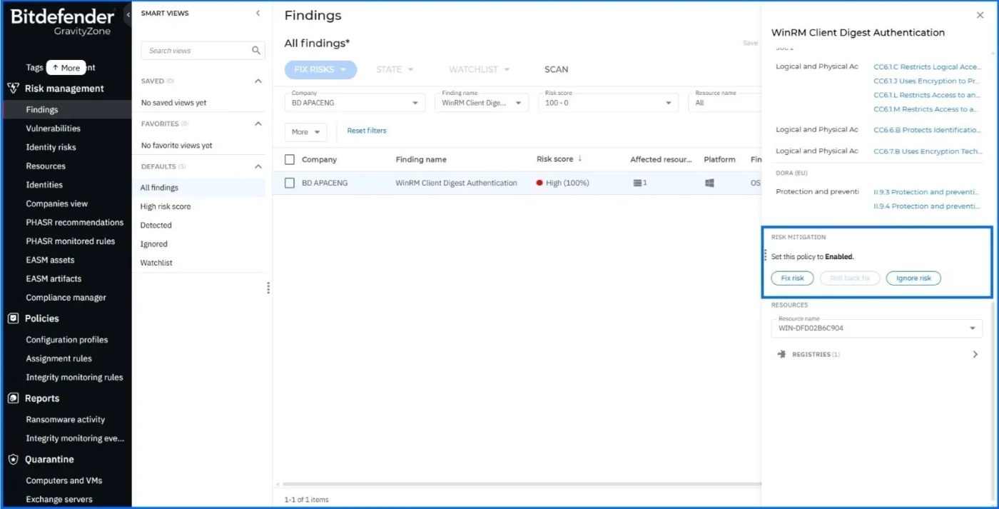 У консолі Bitdefender GravityZone достатньо кількох хвилин, щоб запустити перевірку — система одразу визначає прогалини у політиках безпеки та невідповідності стандартам.